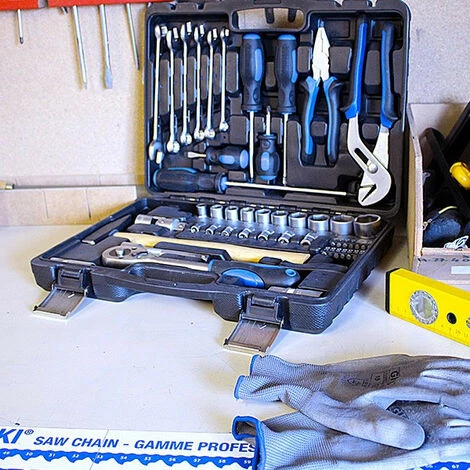 Vous profitez d’une pince, d’une clĂ© Ă molette, de tournevis Ă taille de manches diffĂ©rentes pour visser et dĂ©visser mĂŞme dans les petits espaces, un marteau et de nombreuses clĂ©s plates.